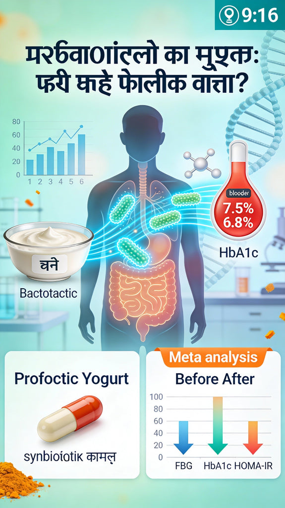 प्रोबायोटिक्स क्या हैं और मधुमेह से कैसे जुड़े? प्रोबायोटिक्स जीवित अच्छे बैक्टीरिया हैं जो आंत के माइक्रोबायोम को संतुलित करते हैं। मधुमेह रोगियों में खराब आंत स्वास्थ्य इंसुलिन रेसिस्टेंस बढ़ाता है, जबकि प्रोबायोटिक्स सूजन कम कर रक्त शर्करा नियंत्रण में सहायक सिद्ध हुए हैं। भारत जैसे देश में जहां 77 मिलियन से अधिक टाइप 2 मधुमेह के केस हैं, ये पारंपरिक खाद्य जैसे दही से आसानी से मिल जाते हैं। टाइप 2 मधुमेह पर रिसर्च के मुख्य निष्कर्ष मेटा-एनालिसिस दिखाते हैं कि प्रोबायोटिक्स उपचार से फास्टिंग ब्लड ग्लूकोज (FBG) 3-13 mg/dL और HbA1c 0.3-0.5% तक कम हो सकता है, खासकर 6-12 सप्ताह में मल्टी-स्ट्रेन फॉर्मूला से। लैक्टोबैसिलस और बिफिडोबैक्टीरियम जैसे स्ट्रेन इंसुलिन संवेदनशीलता बढ़ाते हैं और लिपिड प्रोफाइल सुधारते हैं। सिनबायोटिक्स (प्रोबायोटिक्स + प्रीबायोटिक्स) अकेले प्रोबायोटिक्स से बेहतर परिणाम देते हैं। टाइप 1 मधुमेह में प्रभाव टाइप 1 में अध्ययन कम हैं, लेकिन मल्टीस्पीशीज प्रोबायोटिक्स से HbA1c और सूजन में कमी देखी गई। बच्चों में छोटे HbA1c ड्रॉप (~0.25%) नोट हुए, लेकिन बड़े ट्रायल्स की जरूरत है। प्रोबायोटिक दही और सप्लीमेंट्स के फायदे प्रोबायोटिक दही से T2D में FBG, HbA1c और LDL कम होता है। भारतीय घरों में घर का दही या छाछ रोजाना लें: बिना चीनी का, नट्स के साथ। सप्लीमेंट्स डॉक्टर की सलाह से लें, खासकर इंसुलिन यूजर्स के लिए। भारतीय आहार में शामिल करने के टिप्स रोज 1 कटोरी प्लेन दही या लस्सी पिएं, जिसमें लाइव कल्चर हो। प्रीबायोटिक्स के लिए प्याज, लहसुन, केला जोड़ें। पोर्शन कंट्रोल रखें और ब्लड शुगर मॉनिटर करें। सावधानियां और सलाह प्रोबायोटिक्स सहायक हैं, मुख्य उपचार नहीं; डॉक्टर से सलाह लें। व्यक्तिगत रिस्पॉन्स चेक करें, खासकर खराब कंट्रोल वाले मामलों में। संतुलित डाइट, व्यायाम के साथ मिलाकर इस्तेमाल करें। https://pmc.ncbi.nlm.nih.gov/articles/PMC8166562/ https://tap.health/probiotics-prebiotics-diabetes/ https://www.frontiersin.org/journals/endocrinology/articles/10.3389/fendo.2024.1392306/full