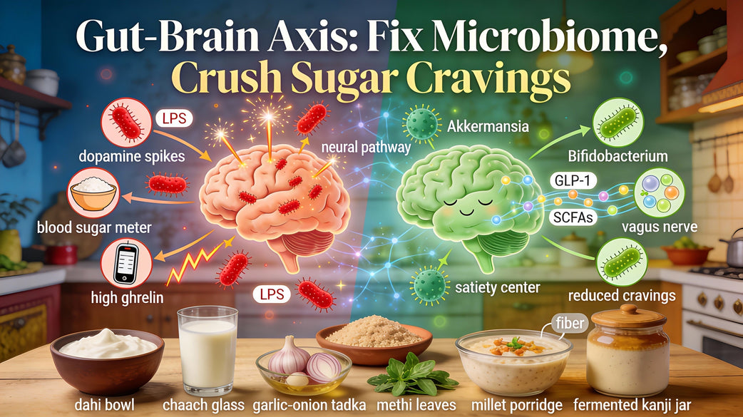 The gut-brain axis connects your intestinal microbiome to brain centers controlling hunger and reward, influencing sugar cravings in diabetes through hormones like GLP-1 and microbial signals that modulate dopamine and appetite. Dysbiosis disrupts this axis, amplifying sweet cravings via inflammation and altered short-chain fatty acids (SCFAs), but restoring beneficial bacteria can boost GLP-1 secretion to curb overeating and stabilize blood sugar. Gut-Brain Signals and Cravings Gut microbes communicate with the brain via the vagus nerve, producing metabolites like SCFAs that stimulate GLP-1 release from intestinal L-cells, signaling fullness and reducing reward-driven sugar intake. In T2D, low diversity depletes Akkermansia muciniphila and Bifidobacterium, which normally enhance GLP-1 and curb ghrelin; this leads to heightened hypothalamic cravings and dopamine spikes from sweets, mimicking addiction. GLP-1: Microbiome's Natural Ozempic Beneficial bacteria ferment fiber into butyrate and propionate, activating GPR41/43 receptors to increase GLP-1, which slows gastric emptying, lowers post-meal glucose spikes, and dampens sweet cravings by acting on brain satiety centers. Studies link higher Faecalibacterium prausnitzii levels to elevated GLP-1 and fewer cravings in diabetics; prebiotics like FOS amplify this effect, mimicking GLP-1 agonists without drugs. Dysbiosis Fuels Sugar Addiction Harmful overgrowth of Proteobacteria and low SCFA producers inflame the gut-brain axis, raising LPS endotoxins that boost brain inflammation, ghrelin, and dopamine responses to sugar—creating a cycle of cravings and insulin resistancee. T2D patients show altered Firmicutes/Bacteroidetes ratios tied to compulsive eating; processed diets worsen this, but fermented foods restore balance. Indian Fixes for Gut-Brain Balance Start with daily dahi or chaach (probiotic-rich) paired with prebiotic garlic-onion tadka and millets to feed GLP-1-boosting bacteria; add methi or banana for FOS. Practice pranayama post-meal to calm vagus nerve signals, and swap late sweets for fiber-fermented kanji; track cravings via CGM for 2 weeks to see drops. https://www.dexcom.com/en-ca/blog/role-of-gut-health-in-blood-sugar-management https://pmc.ncbi.nlm.nih.gov/articles/PMC10698456/ https://www.eastsidefamilyhealth.com/blog/the-impact-of-gut-microbiota-on-diabetes-management-emerging-research-and-therapeutic-insights https://www.the-scientist.com/a-question-of-balance-how-the-gut-microbiome-influences-diabetes-70525